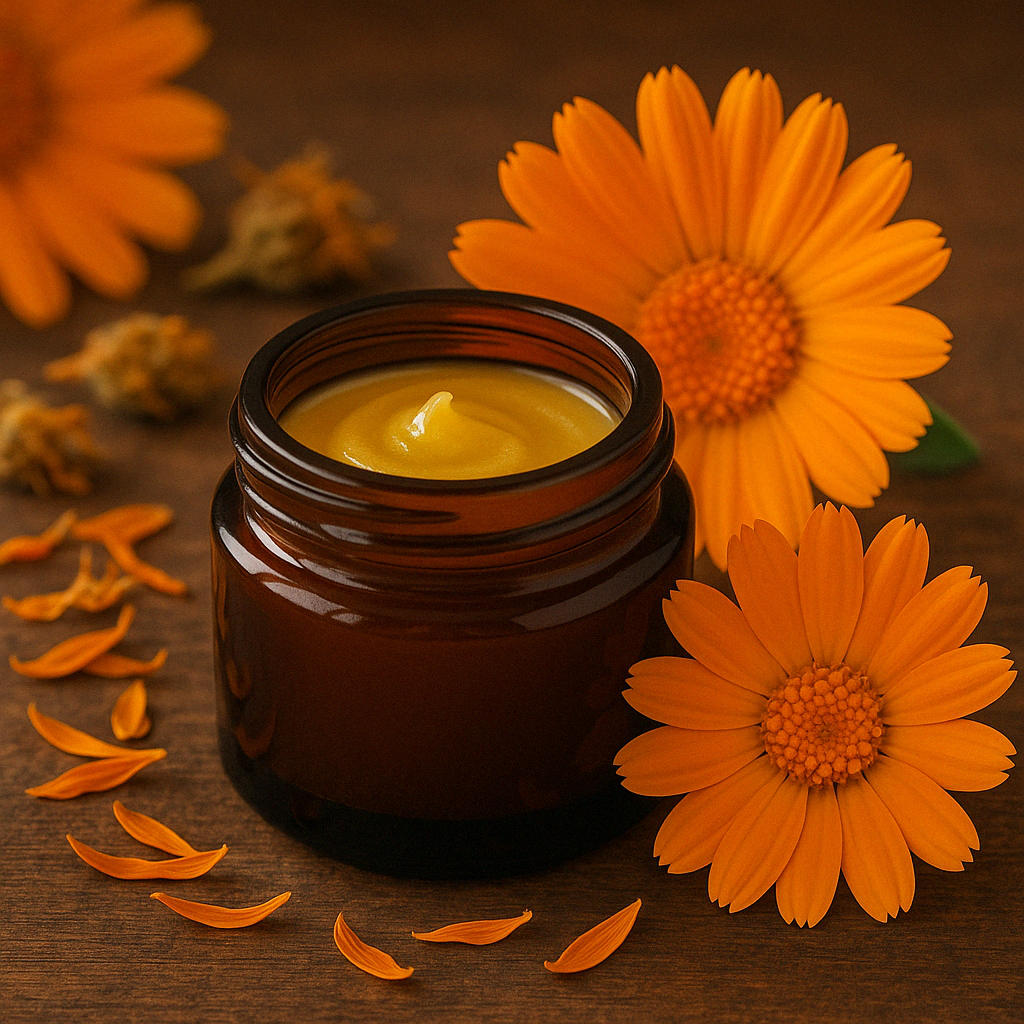 Hochwärtige Ringelblumensalbe aus Bienenwachs, Mandelöl, Kokosöl und ätherische Öle.